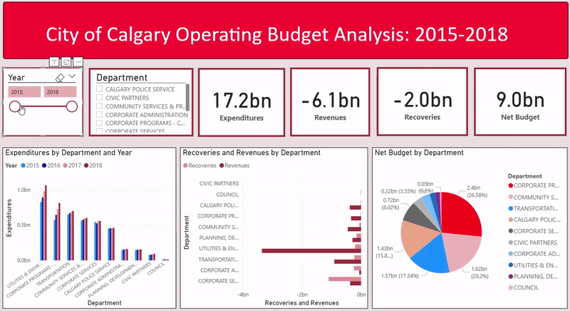 Interactive Power BI dashboard analyzing operating budget of the City of Calgary (data source provided to the public)